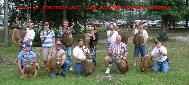 (Back row L to R) Class V & Overall Winner - Steven W. Blosser (Halifax), Class VI Winner - Robert W. Carter - Not pictured (Northampton), Class VII Winner - Hunter Patterson (Southampton), Class VIII Winner - Jackie W. Andrews (Pittsylvania), Class IX & Youth Deer Winner- Bradley D. Seery (Accomack), Class X Winner - James T. Williams (Sussex), Class XI Winner - Lonnie M. Upton - Not pictured (Surry), Class XII Winner - (King & Queen). Class XIII Winner - Mitchell B. Harper - Not pictured (Rappanhannock), Class XIV Winner - Benjamin G. Murray - Not pictured (Northumberland), Youth Turkey Winner - Brett C. Haislip - Not pictured (Fluvanna).